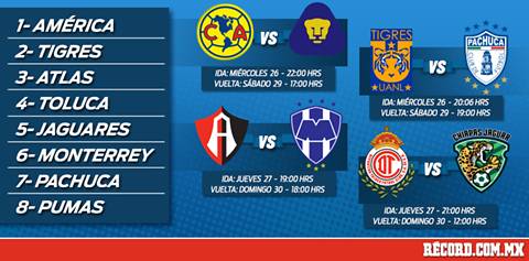 por Roberto Canario foto cortesia record.com Ciudad de Mexico 11-24-14 mérica, Tigres y Toluca respetan sus horarios de local para la Vuelta; Atlas lo mueve a domingo a las 18:00 horas La Ida entre Pumas y Águilas se jugará a…