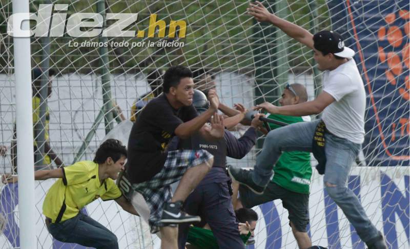 Inmediatamente finalizó el clásico Marathón-Real España, aficionados del equipo verdolaga se saltaron el muro perimetral para ingresar a la cancha a agredir a jugadores del conjunto aurinegro.