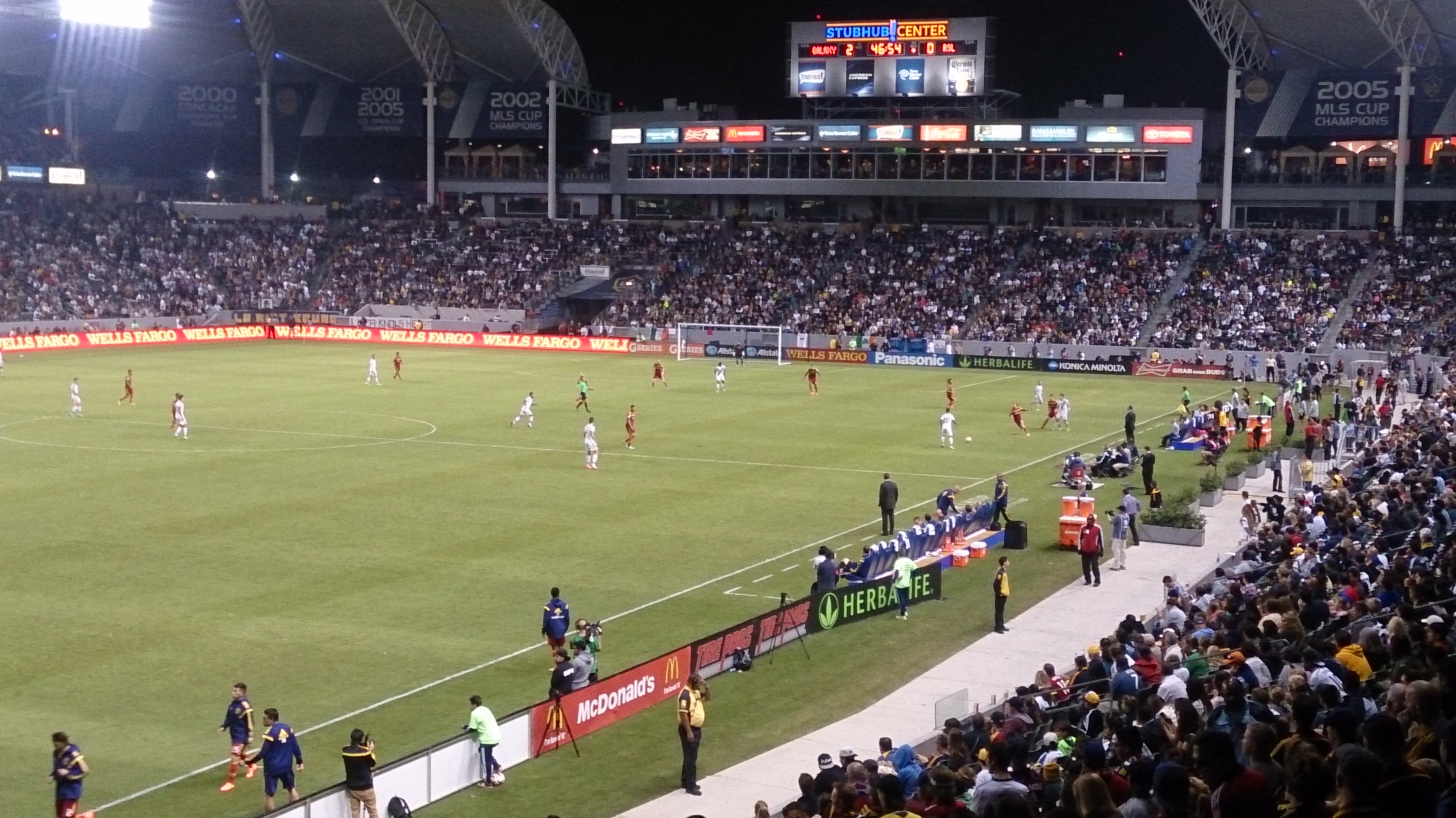 Los equipos de en camina al la metidad de la cancha del Stub Hub Center para presentarse ante el publico y entonar el Himno Nacional de los Estados Unidos.